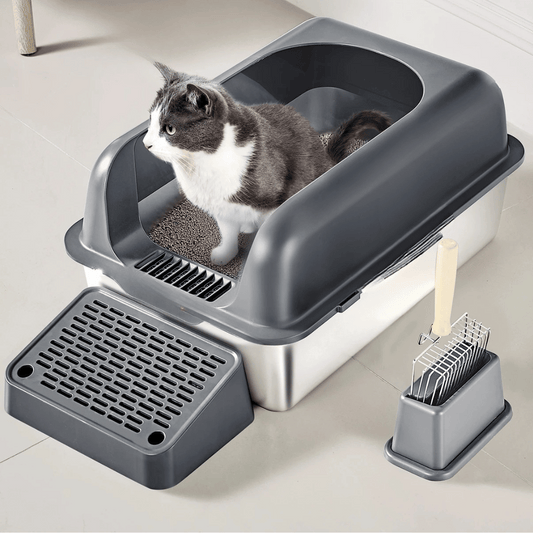 Large High-Sided Cat Litter Box with Stainless Steel Tray | Spill-Board, Scoop & Holder Included