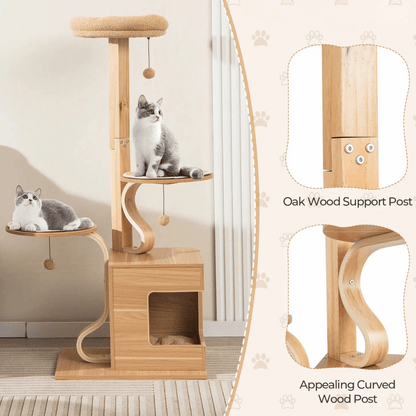 Tall Oak Wood Cat Tree with Plush Perch, Condo & Platforms